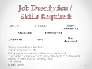 . Front of House Manager Duties Manage the Reception Telephony Room Reservations Catering and Cleaning over a large account. Casual Dining Restaurant Manager Benefits. Experience in a Front of House Role in the arts or service industry.